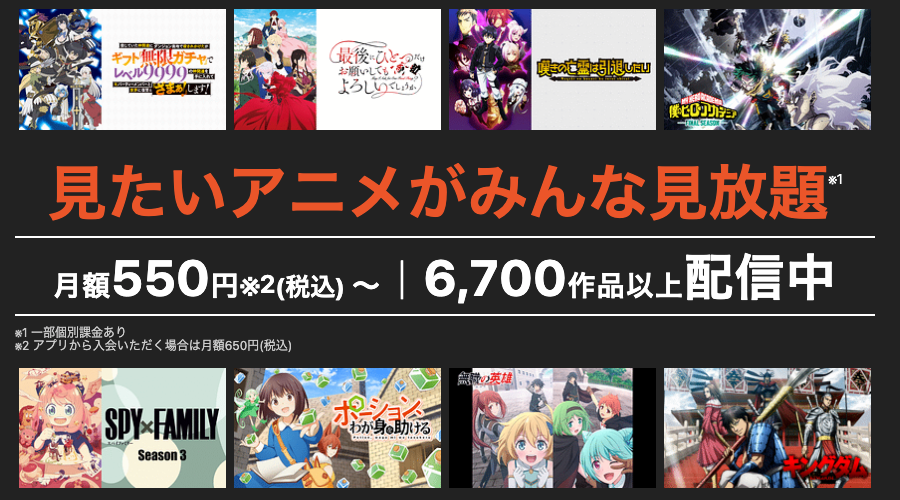 アニメジャンルに特化した動画配信サービスとして、6,700作品以上のアニメが月額550円で見放題となっており、アニメファンにとって最もコスパの良いサービスに加えて、地上波で放送中の最新TVアニメの見逃し配信が充実しており、他の動画配信サービスよりも早く最新話を視聴できる点が大きな強みです。